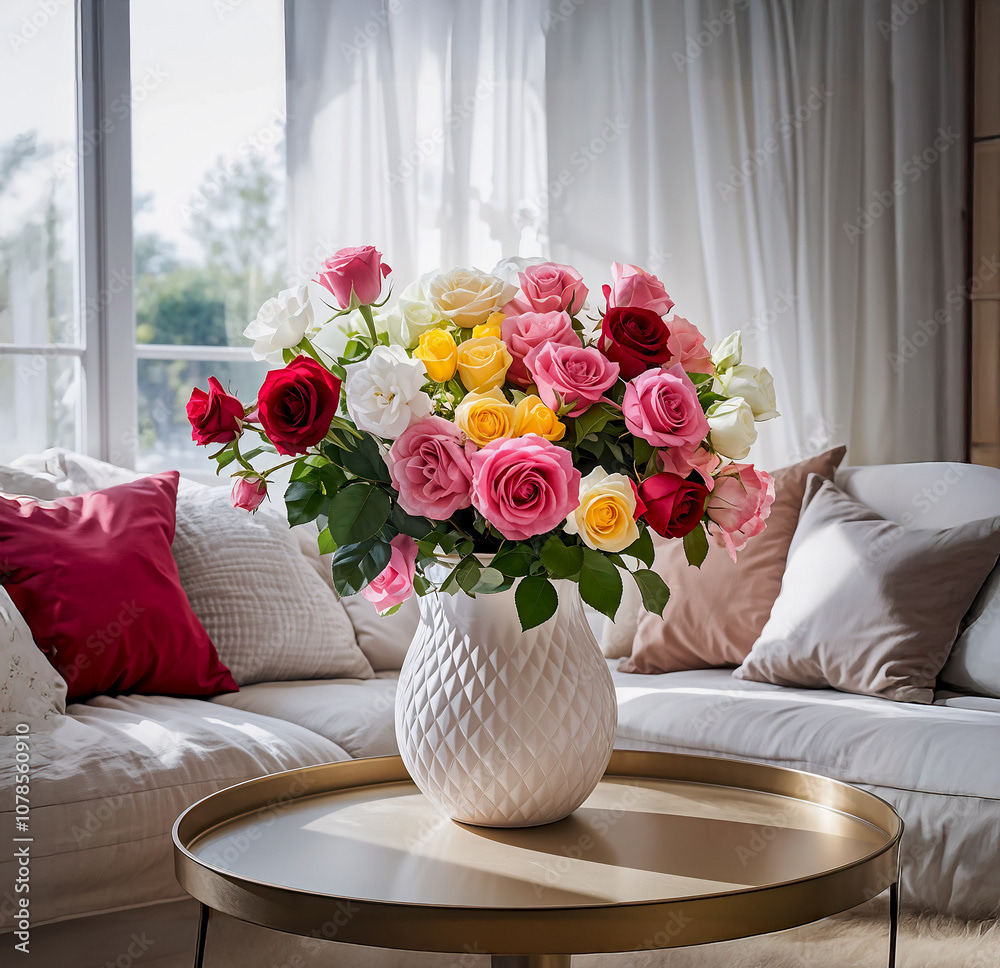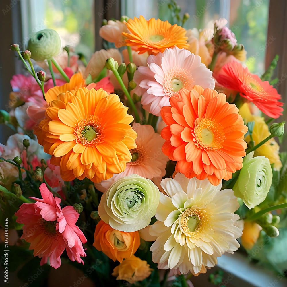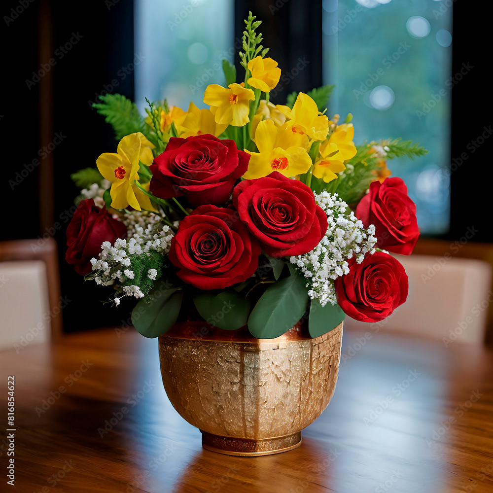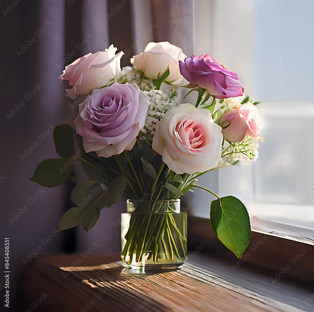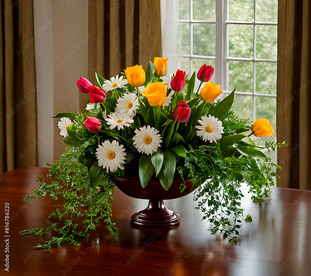 Bouquets and floral arrangements of a wide variety of flowers and styles, in vases, isolated, on windowsills or on furniture, royalty-free downloads for your projects